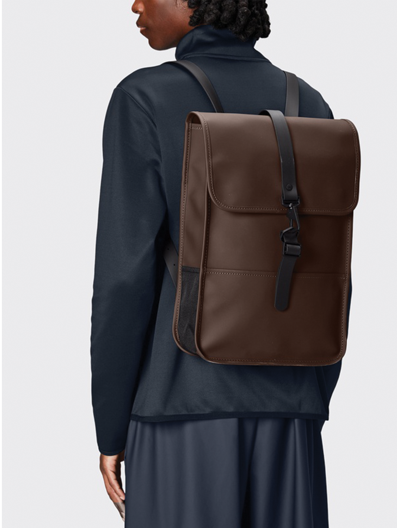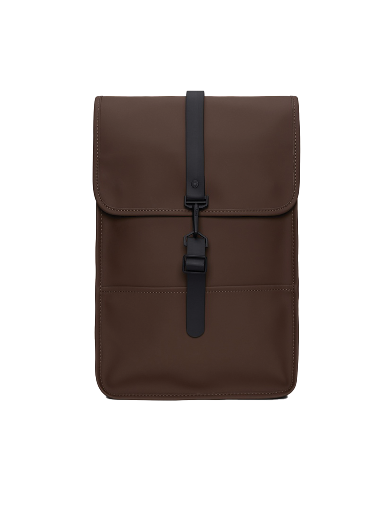 Rains Backpack Mini is a downscaled version of Backpack. The silhouette is characterized by its prominent flap and central strap with carabiner closure. This clean and ever contemporary waterproof rucksack features an internal laptop pocket, a main compartment, and a concealed external phone pocket on the back panel.