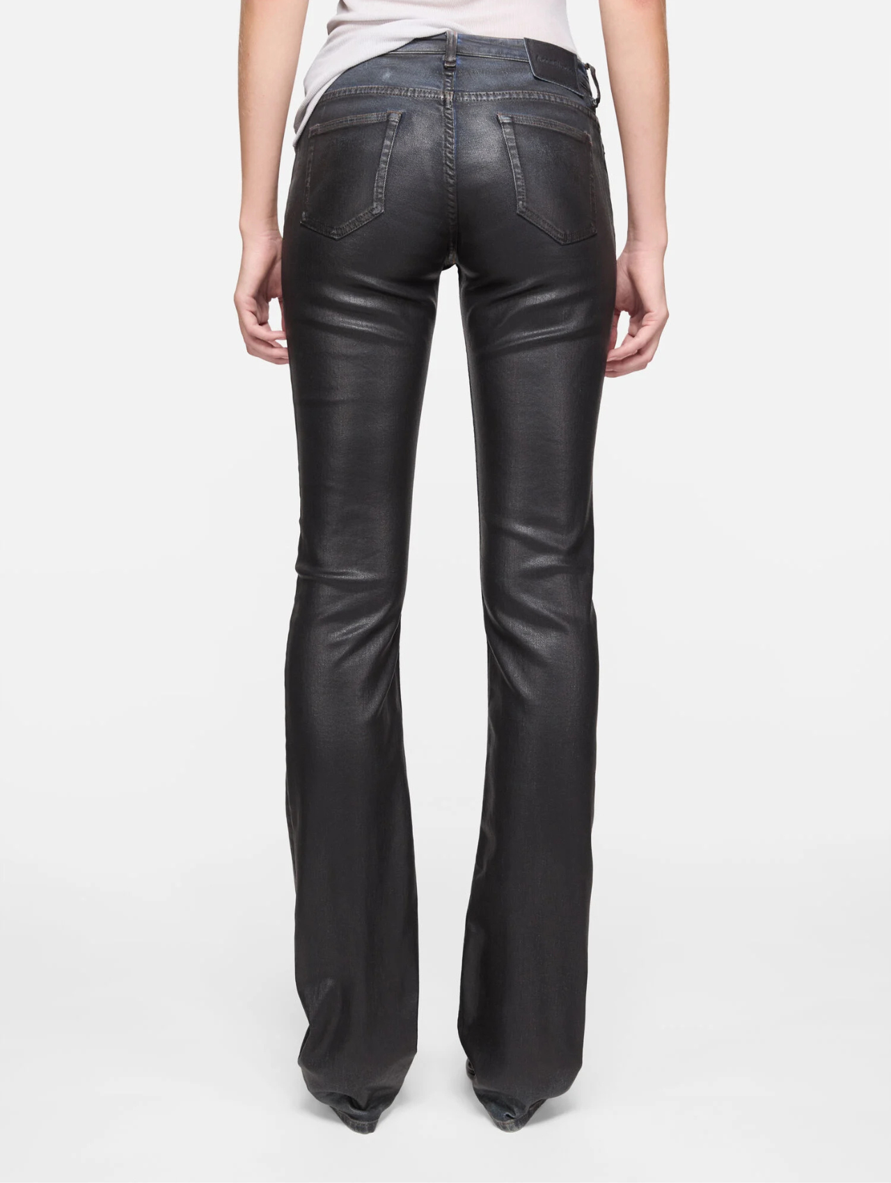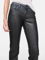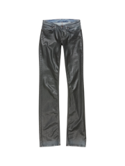 Jeans feature a pressed black leather finish on stretch denim. 2013 jeans are cut to a skinny fit with a high waist, tapered leg, long length, and zipper fly closure.