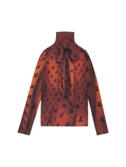 A sheer mesh funnel neck top with a seasonal teddy bear print, finished with a trompe l’œil bow. Inspired by Björk and Swedish folklore, the Acne Studios AW25 collection brings together sheer silk, sharp leather and tailored cuts on one side, and teddy-bear coats and cashmere hoodies on the other. It’s cosy meets cut throat.