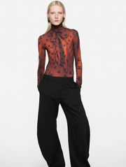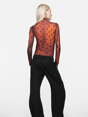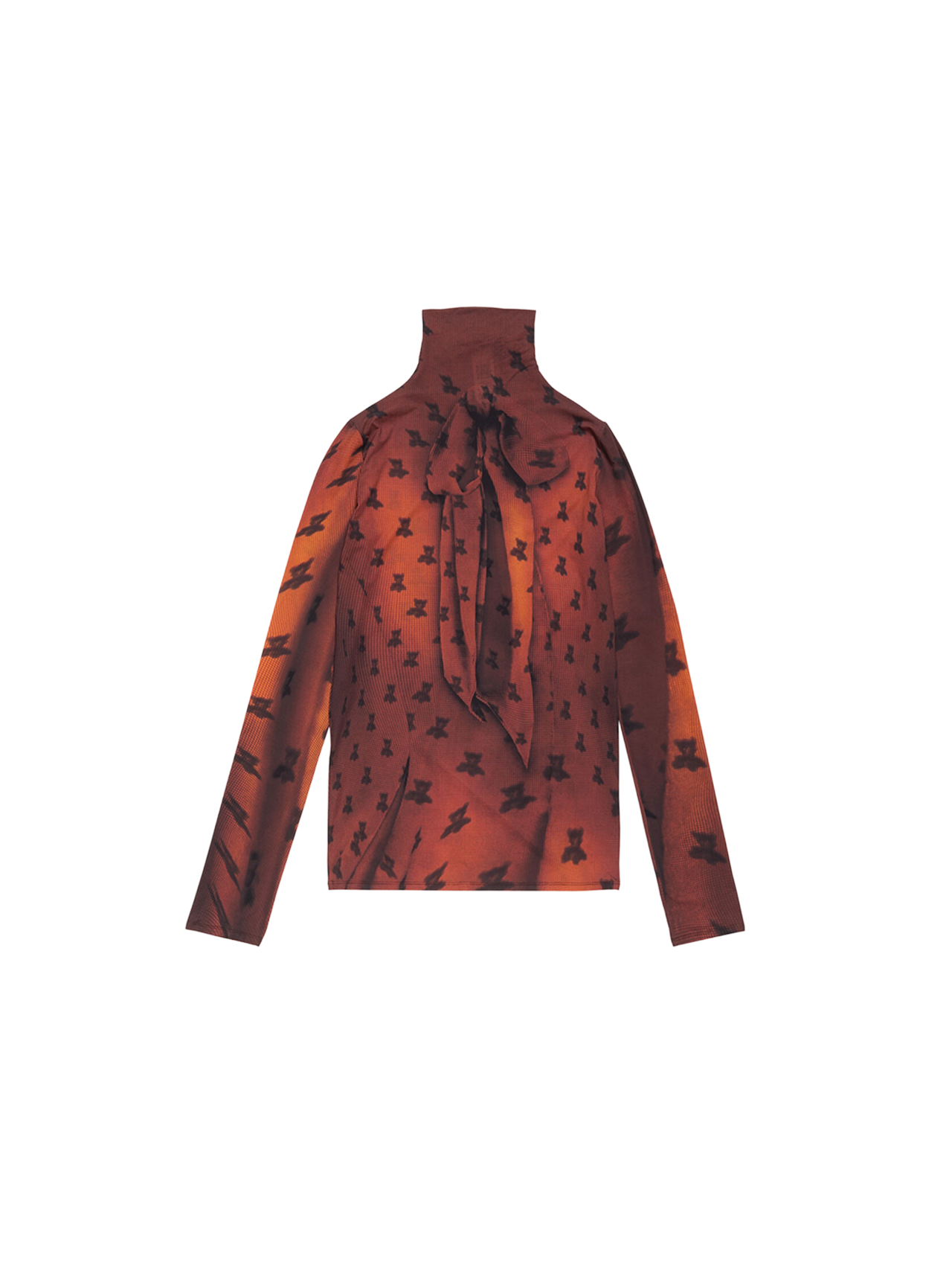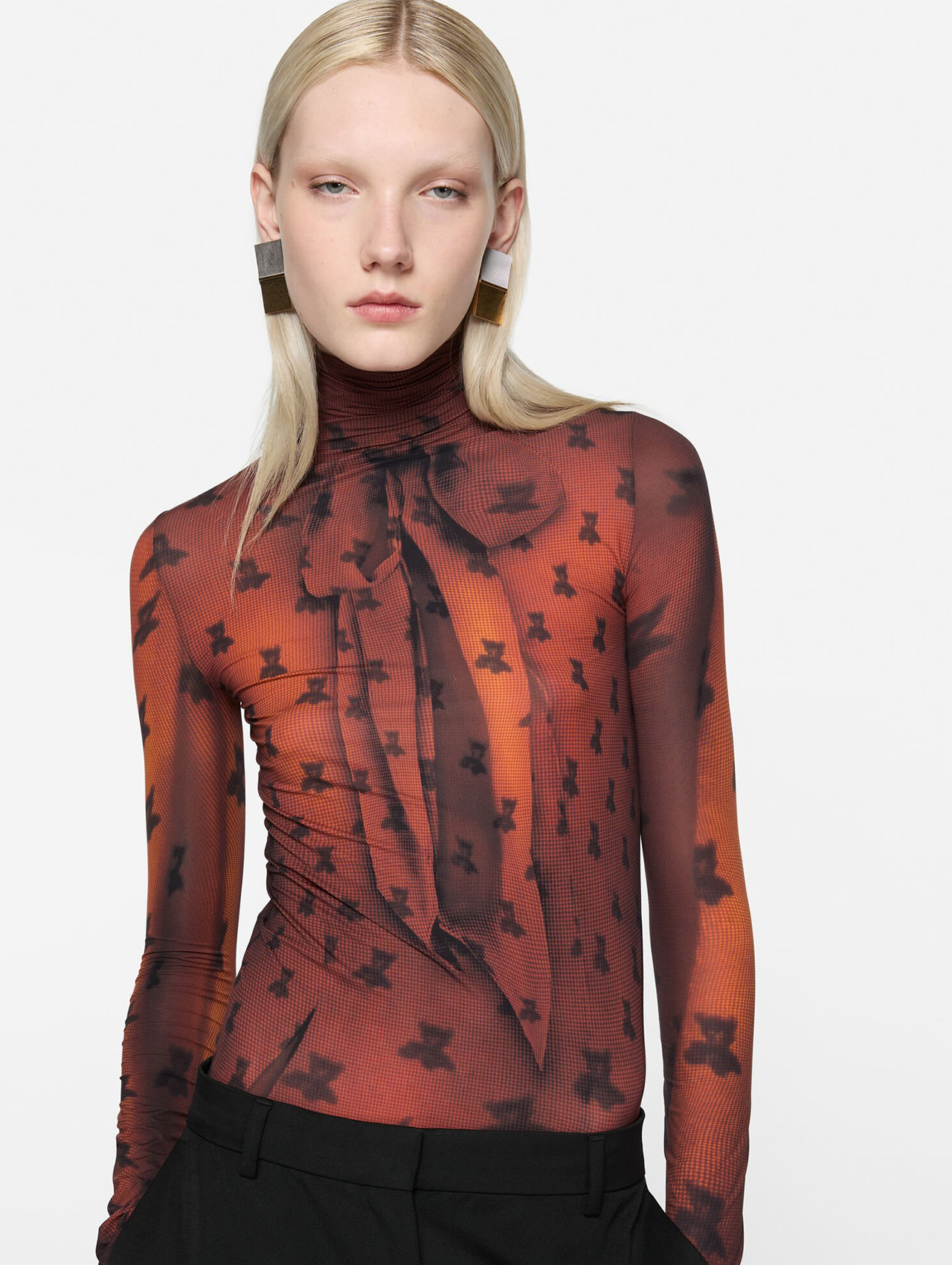 A sheer mesh funnel neck top with a seasonal teddy bear print, finished with a trompe l’œil bow. Inspired by Björk and Swedish folklore, the Acne Studios AW25 collection brings together sheer silk, sharp leather and tailored cuts on one side, and teddy-bear coats and cashmere hoodies on the other. It’s cosy meets cut throat.