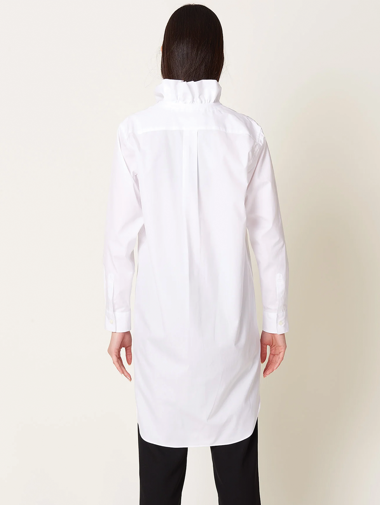 Drawstring ruffle collar, Curved bib detail, Front button fastening