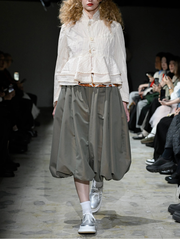 Led by Tao Kurihara, a Central Saint Martins graduate and former mentee of Junya Watanabe, Comme des Garcons TAO is an exercise in baroque, explicit femininity tempered by subtle masculinity. The evasive designer keeps her inspirations secret, but the mainstay visual elements of the line include up-cycled wedding dresses, folkloric whimsy, and frilled but distressed silhouettes that resemble punk imbued cake decorations.