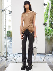 Drawing on the work from home creative process, as well as taking inspiration from French Surrealists, the team at MM6 created a Cadavres Exquis of a collection. Each designer worked on a garment in isolation, and the result is suitably eclectic. A bricolage of minimalist punk and 80s club culture aesthetics emerge – and staples from the house archives are reinvigorated with masculine silhouettes and raw feminine detailing.