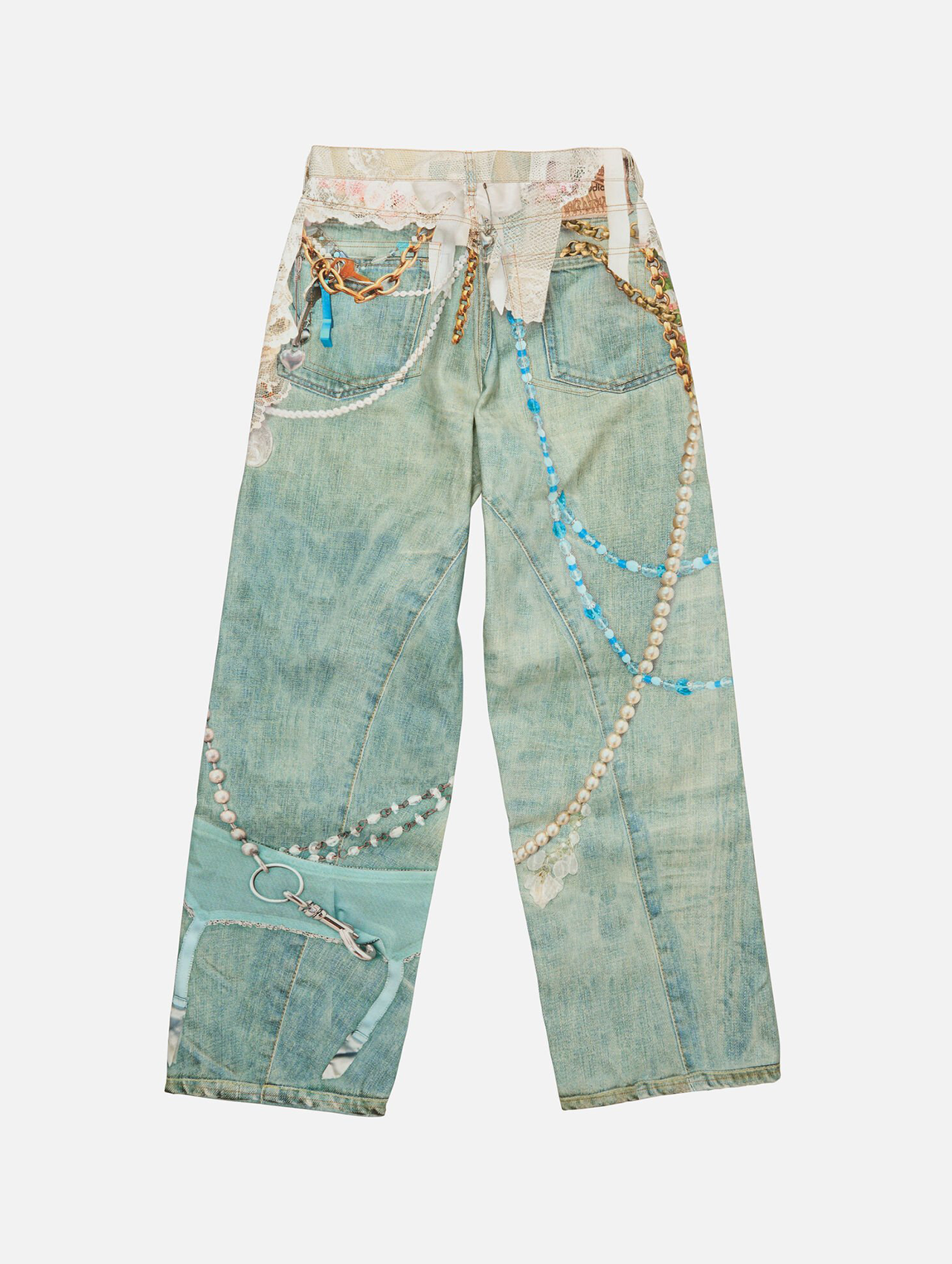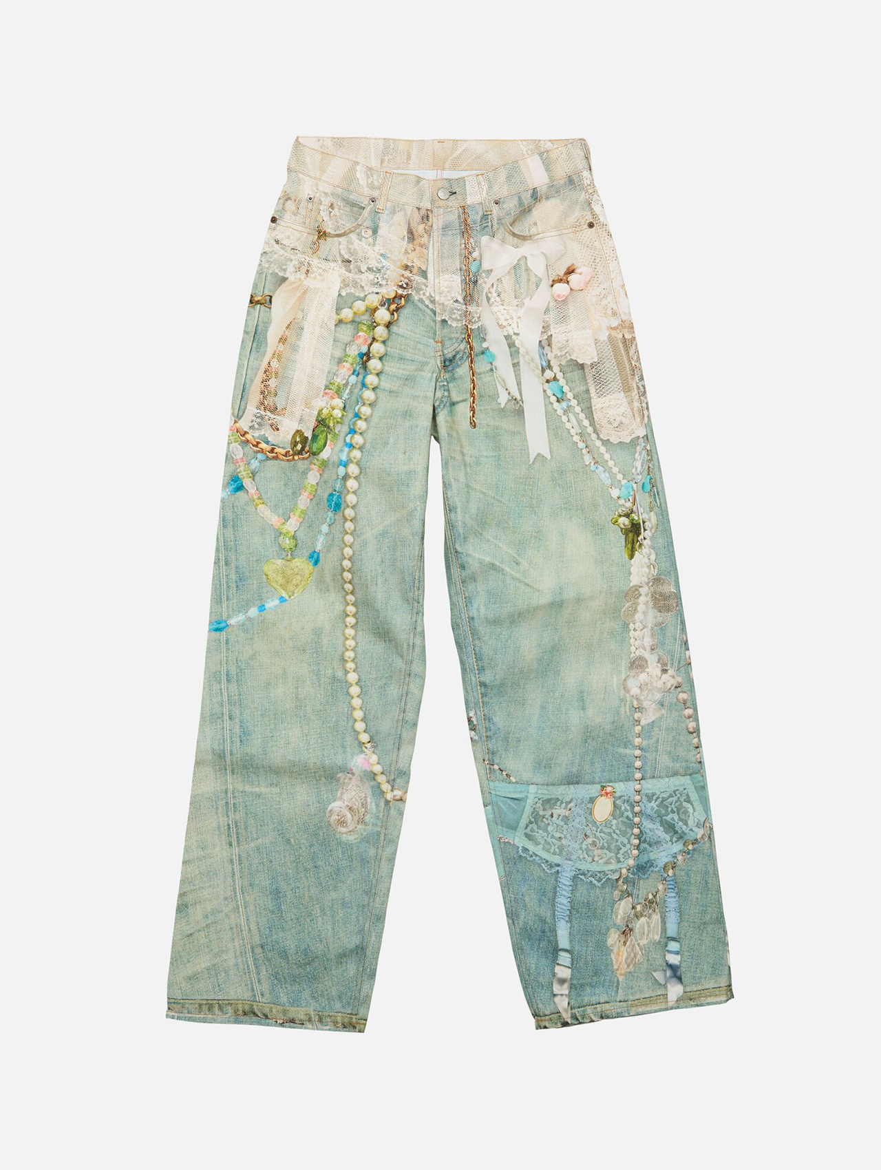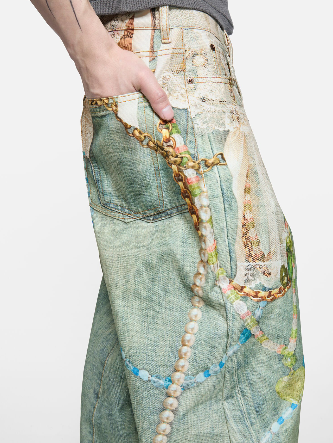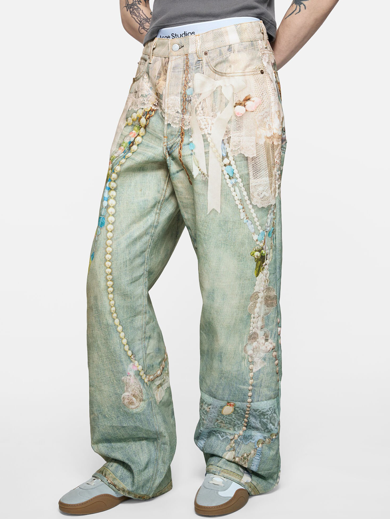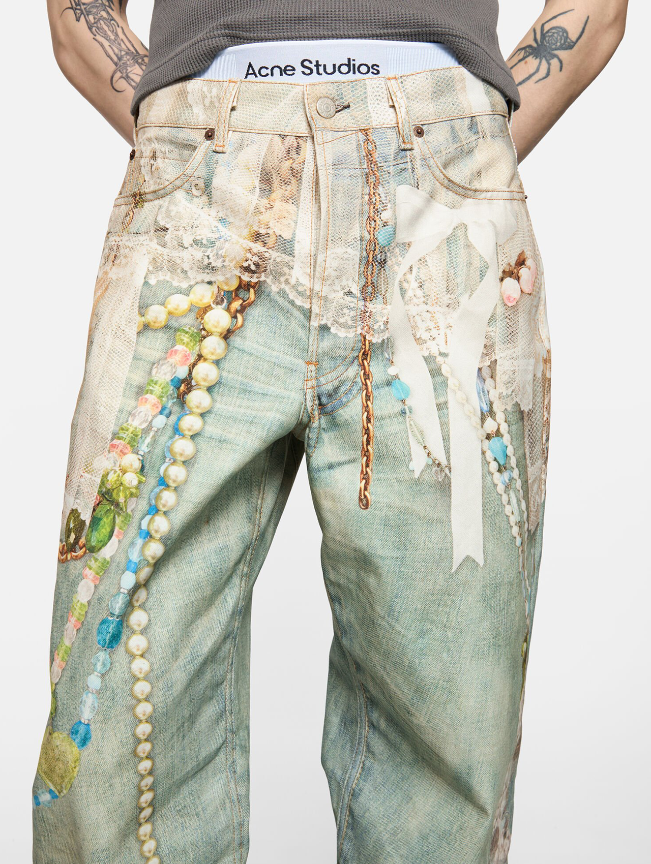 Loose and low, these seasonal, limited edition Acne Studios jeans come with a baggy silhouette and a now iconic trompe l'oeil print. Keychains and laces appear where they shouldn’t, turning everyday denim into something slightly surreal.