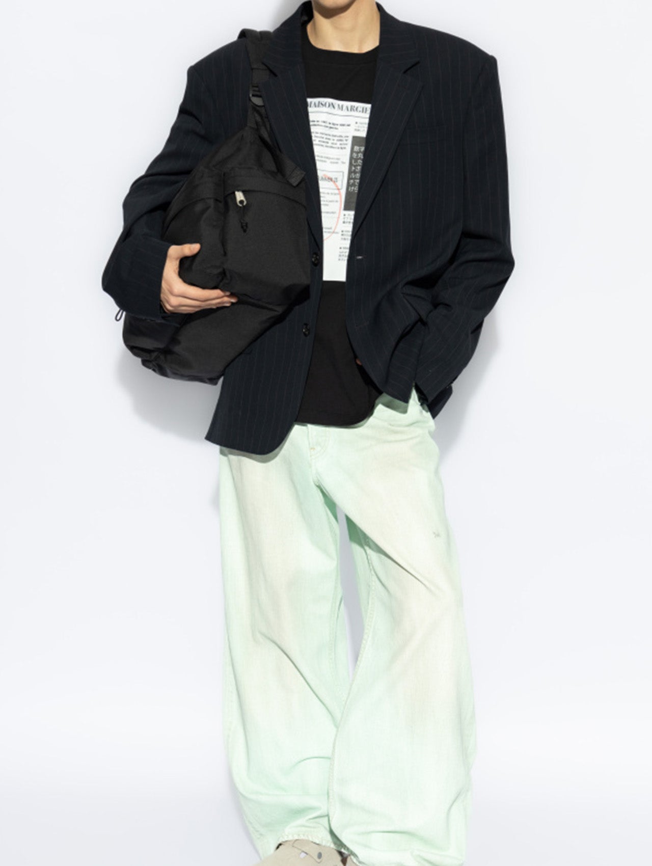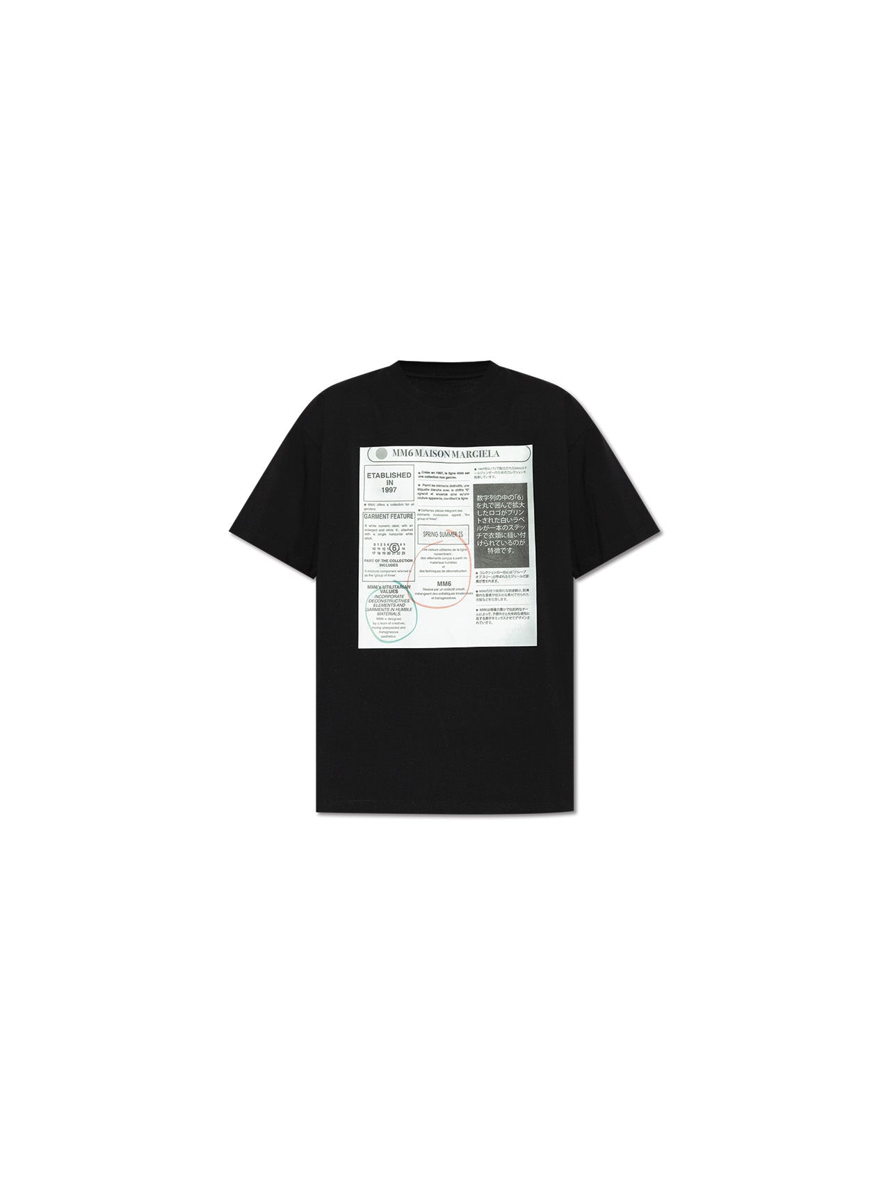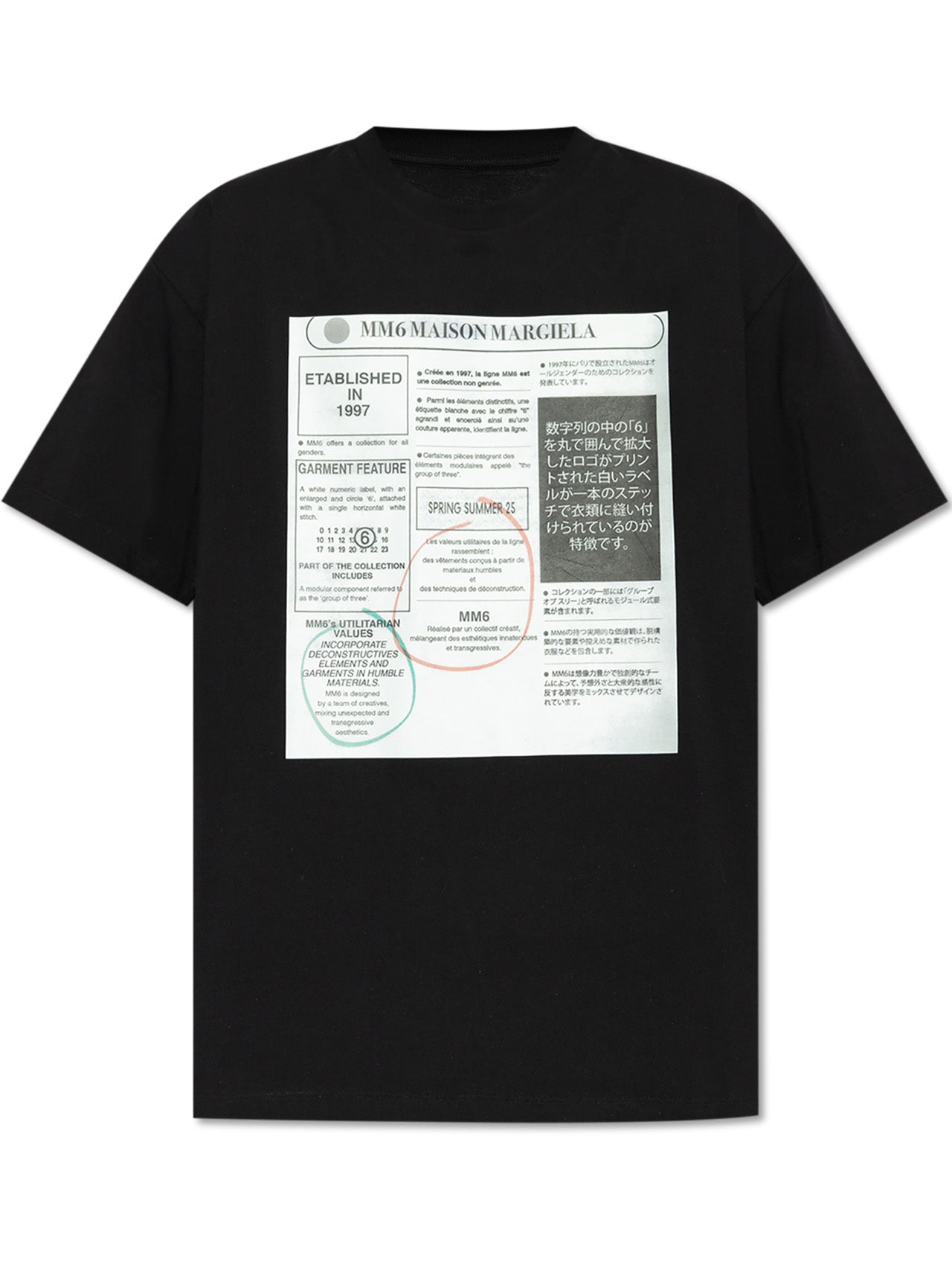 newspaper-style artwork on the front, this unisex t-shirt has a classic crewneck and regular fit, with the signature white stitch line on the back as a quiet nod to the Maison’s identity. The MM6 AVP SS25 collection is all about patches, visible stitching, washed-out colours and raw finishes combined with treatments lifted from the Margiela archives — such as fringes, washed cotton and distressed silk - all designed to help us reconnect with pre-digital life.