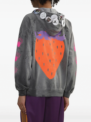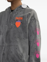 This Zip Hoodies features a playful graphic and a relaxed silhouette, epitomised by the hyper-colour strawberry design. Brett Westfall’s collection continues his exploration of wearable art, transforming everyday garments into expressive canvases. The collection features his signature distressed loungewear sets adorned with eclectic graphics, tie-dye, and paint stains, turning staples like T-shirts and sweat suits into artful statement pieces.