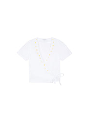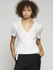 Hand embroidered flowers make a daisy chain around the neck line of Maison Labiche’s delicious spring-time adjustable wrap top. Maison Labiche's penchant for quality cotton, endearingly Euro phrases, and schoolgirl threadwork have won the hearts of kawaii and punk fanatics all over the world.
