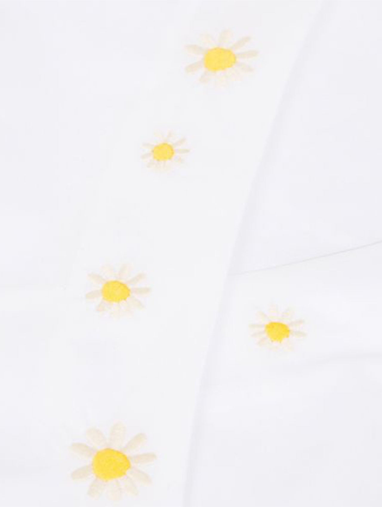 Hand embroidered daisies, Adjustable fit with waist tie, Adjustable button up puff sleeves