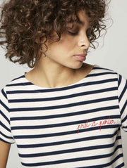 Hand embroidered lettering, Boat neckline, Rolled sleeves, Rib knit