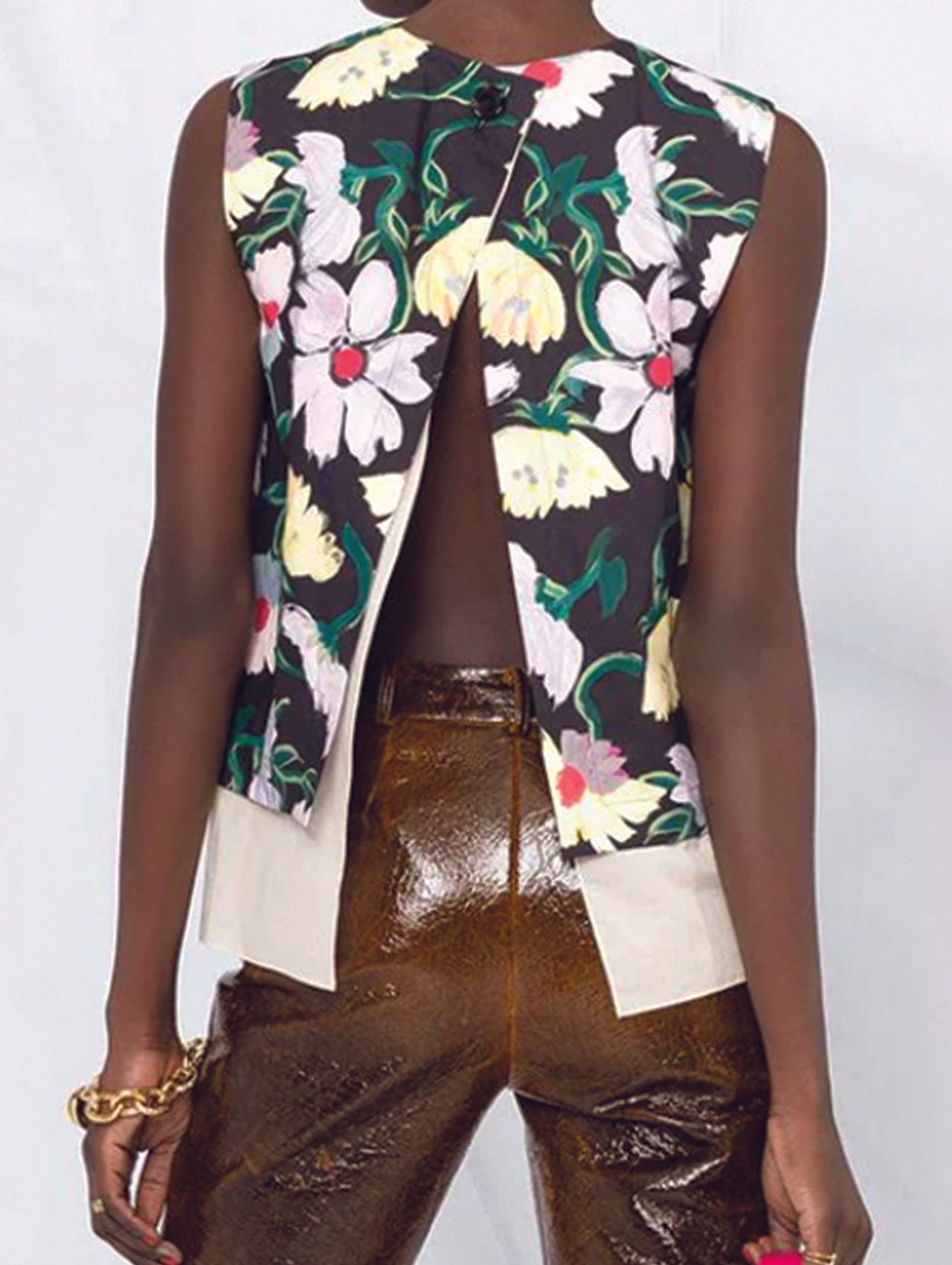The vibrant print speaks for itself in this lush, vest top from Marni. The theme of ‘Marnifesto’ is centred on the spirit of collaborative creativity, and cultivating strength in hardship through collectivism. The Marni team spent the 2020 lockdown dyeing fabric in bathtubs and making garments out of curtains, whilst Risso pulled his favourite pieces from the Marni archives to deconstruct and reinvent for a new era.