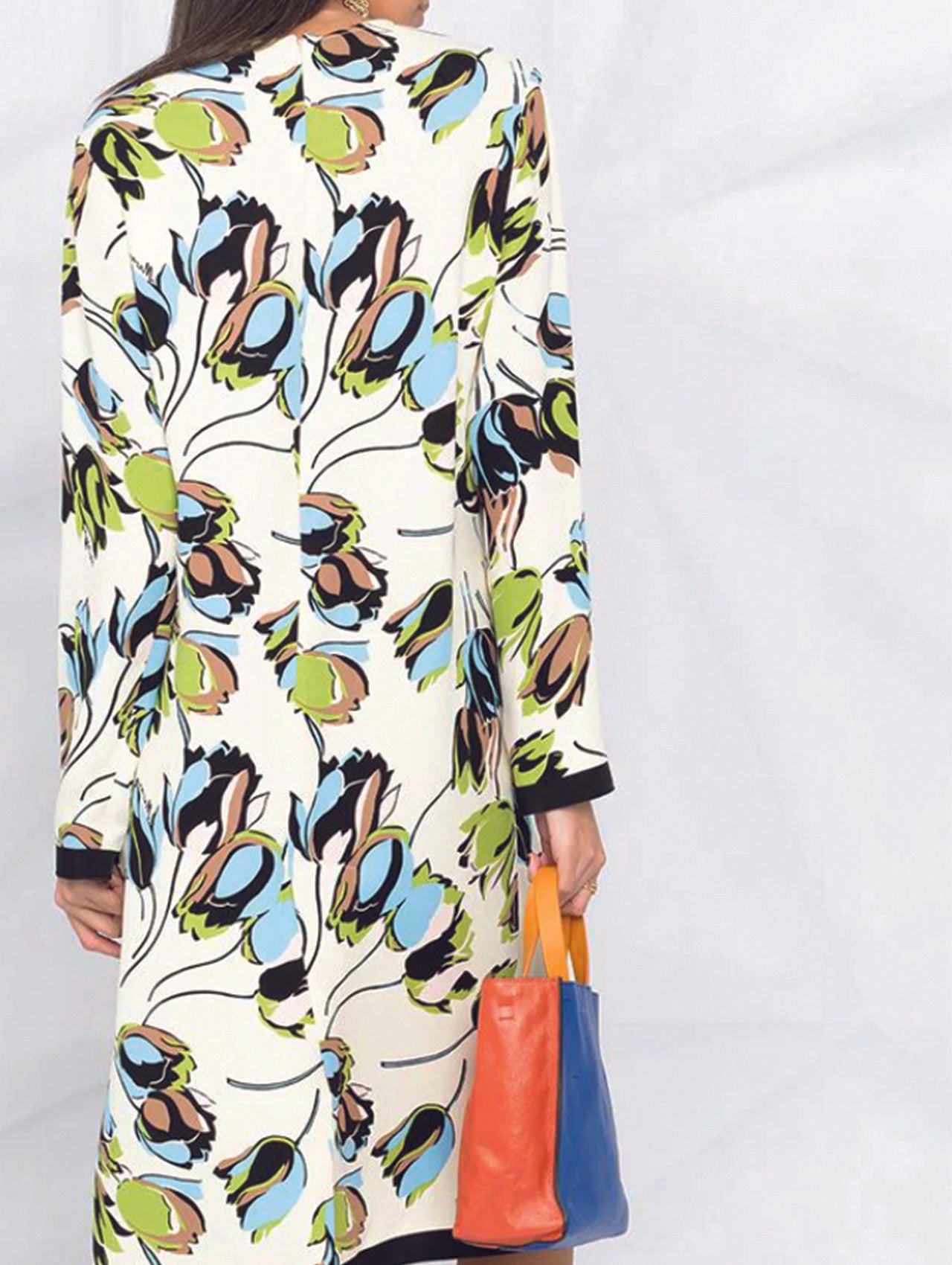 Blue and green tulips decorate this 60s inspired shift, with contrasting black accents. “Romanticism” is the key theme for this collection, with the vitalism of emotion and personality conveyed through Marni’s signature tactility. Risso opts for a slightly more subdued palette, soft draping fabrics and tender prints. Sturm und Drang indeed.