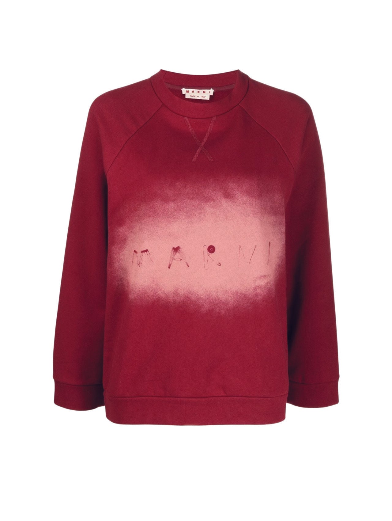 A logo sweatshirt imbued with Marni's signature eclecticism. A romanticist protest against digital tyranny, Risso developed his second lockdown-bound collection entirely by hand. Spray paint, dried flowers and traditional dyeing techniques embellish silhouettes that combine Zoom-meeting loungewear with classic haute couture drama.