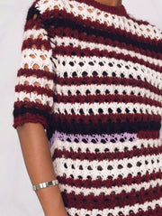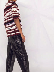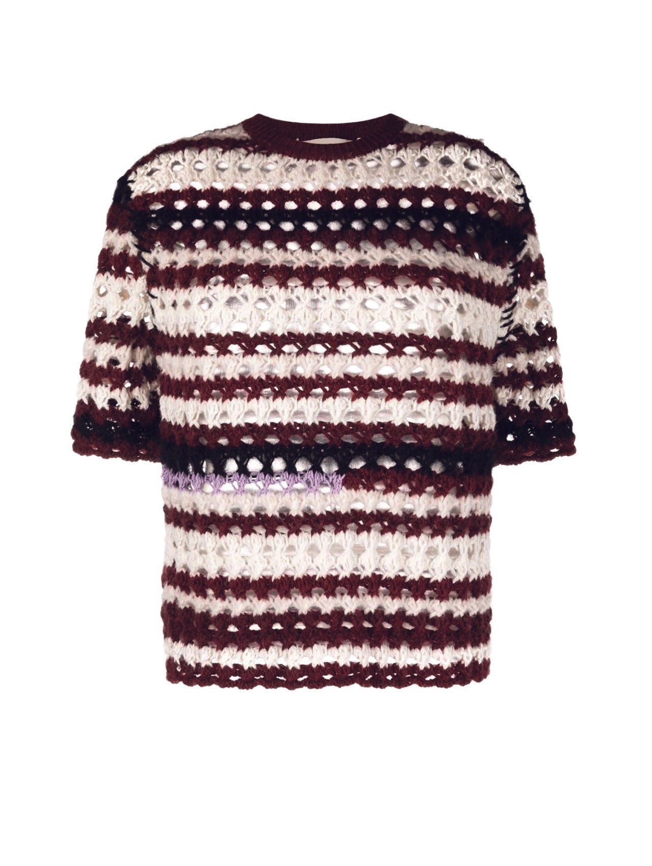 Let your soul breathe in this open knit top from Marni. A romanticist protest against digital tyranny, Risso developed his second lockdown-bound collection entirely by hand. Spray paint, dried flowers and traditional dyeing techniques embellish silhouettes that combine Zoom-meeting loungewear with classic haute couture drama.