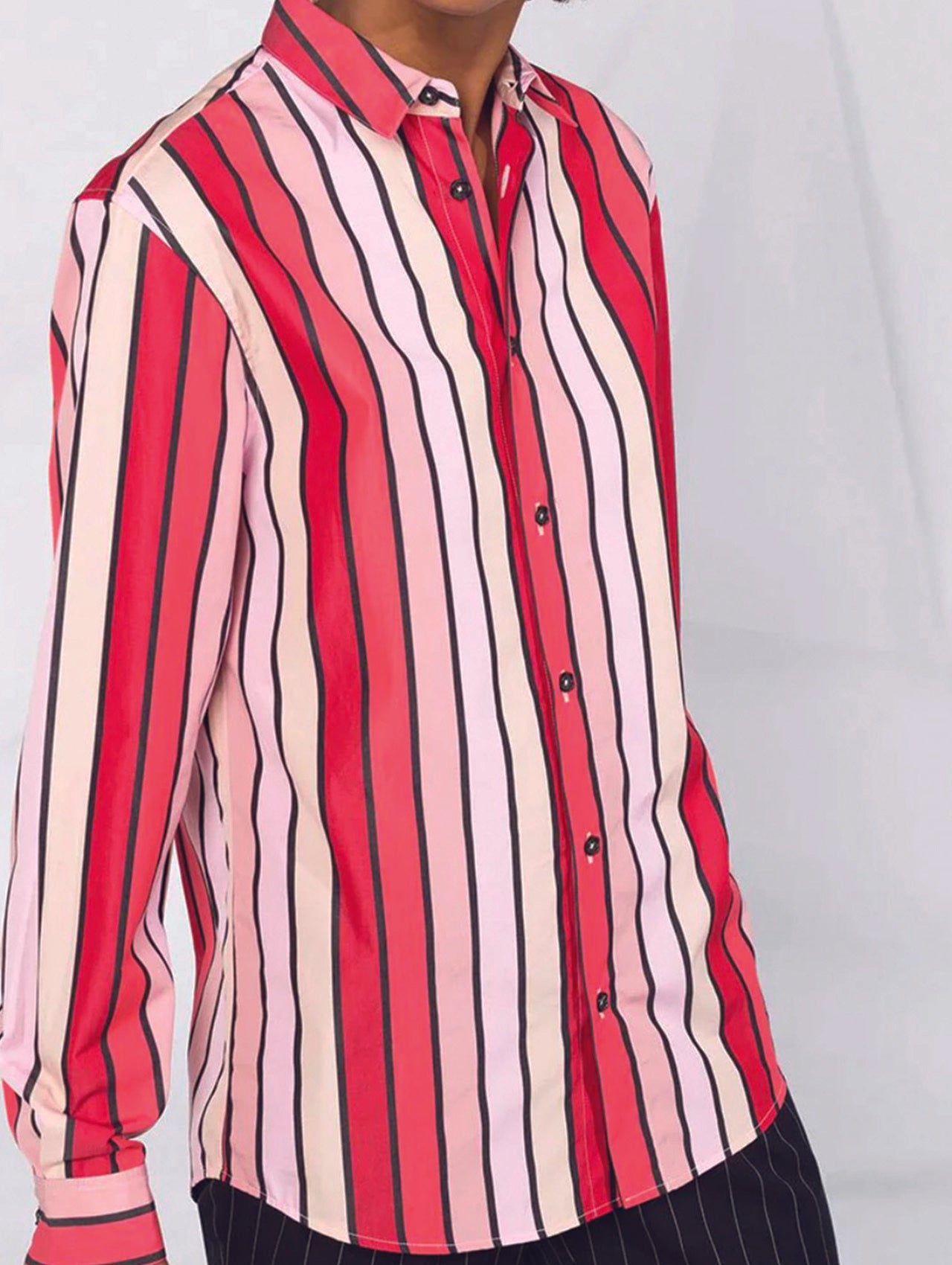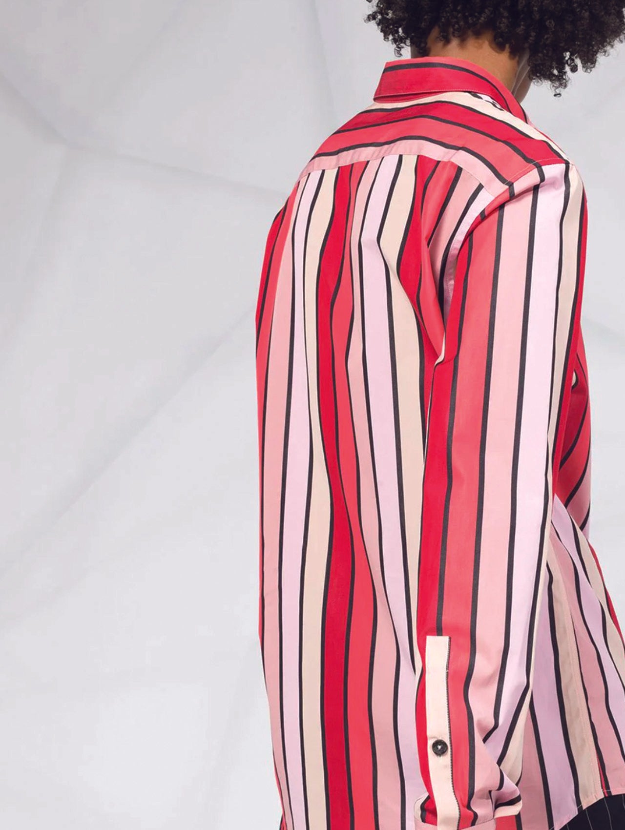 The classic tailored shirt gets a Marni makeover in tonal hues of red and pink. Based on the idea that the brand’s creative process is always in progress, Volume 1 of 2021’s Spring/Summer collection looks at a deliberate clashing of aesthetics to illustrate the hybrid between Marni’s past and present. Risso describes the collection as “Joyful Liberation”.