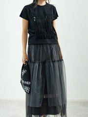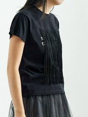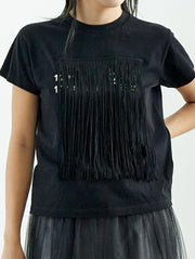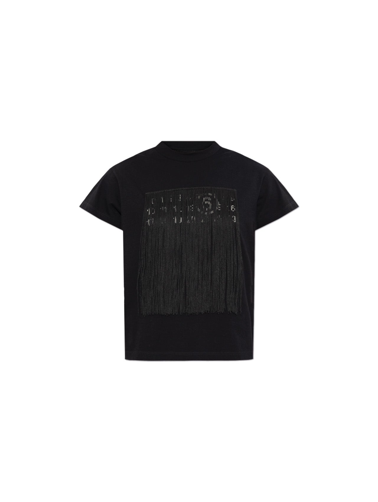 Razzle dazzle but make it fashion... A soft fringe conceals MM6's iconic numeric logo on this soft 100% jersey cotton crew neck tshirt. The MM6 AVP SS25 collection is all about patches, visible stitching, washed-out colours and raw finishes combined with treatments lifted from the Margiela archives — such as fringes, washed cotton and distressed silk - all designed to help us reconnect with pre-digital life.
