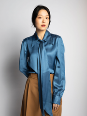 Pointed collar with tie detail, Gathered puff sleeves, Button up closure