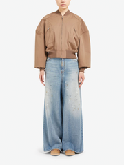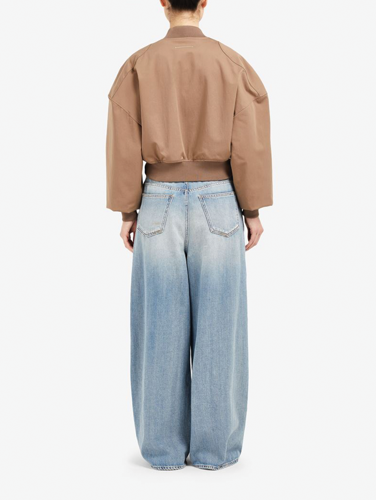 Drawing on the work from home creative process, as well as taking inspiration from French Surrealists, the team at MM6 created a Cadavres Exquis of a collection. Each designer worked on a garment in isolation, and the result is suitably eclectic. A bricolage of minimalist punk and 80s club culture aesthetics emerge – and staples from the house archives are reinvigorated with masculine silhouettes and raw feminine detailing. Note the soft, rounded panels used in the construction of this oversized take on the classic bomber jacket.
