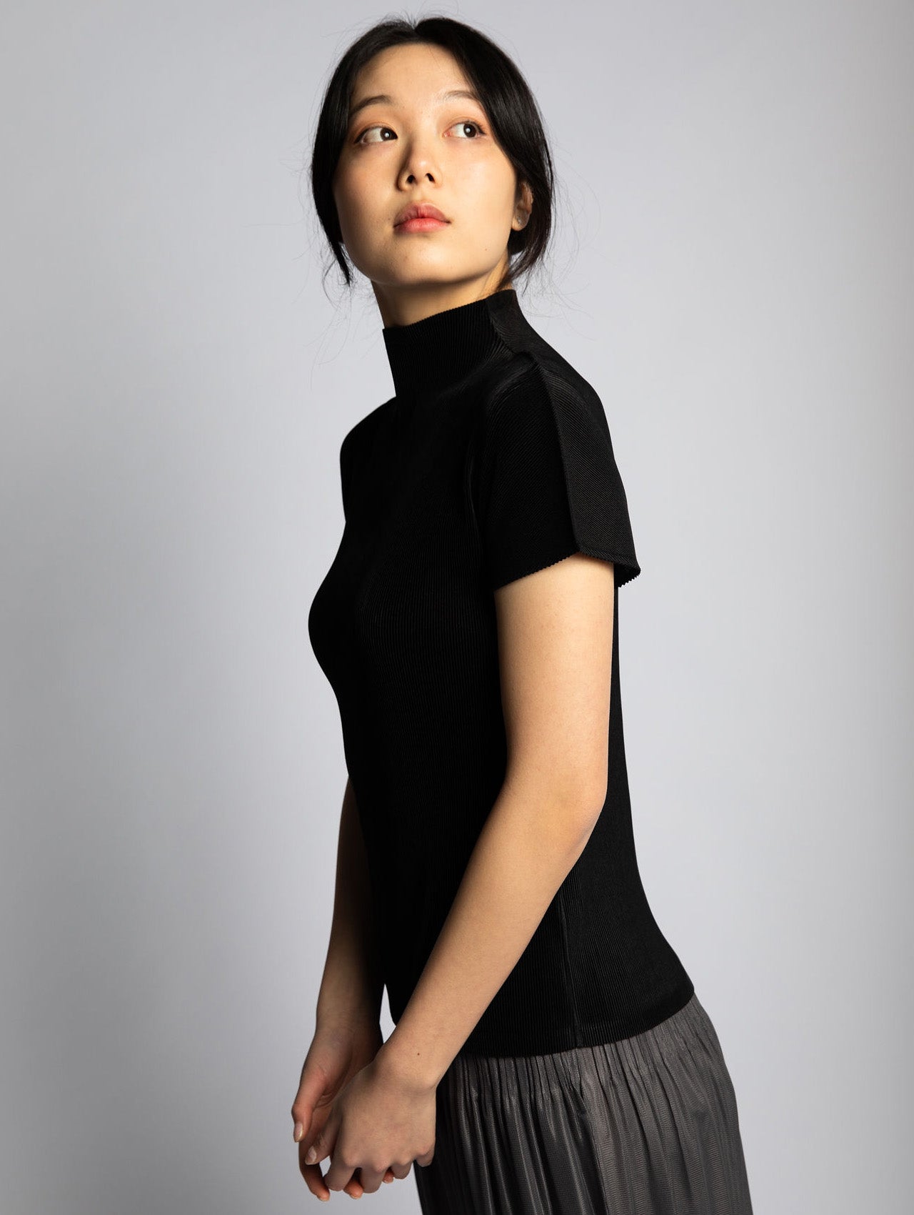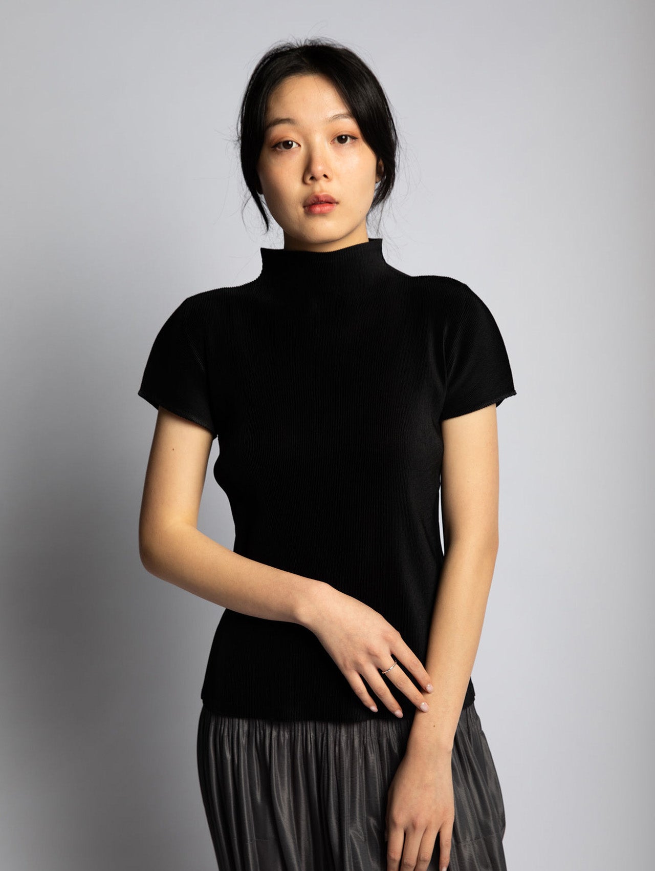 Fine "Mist" pleats, Mock neck collar, Short sleeves