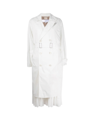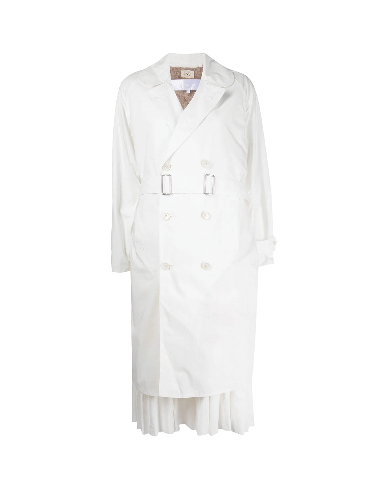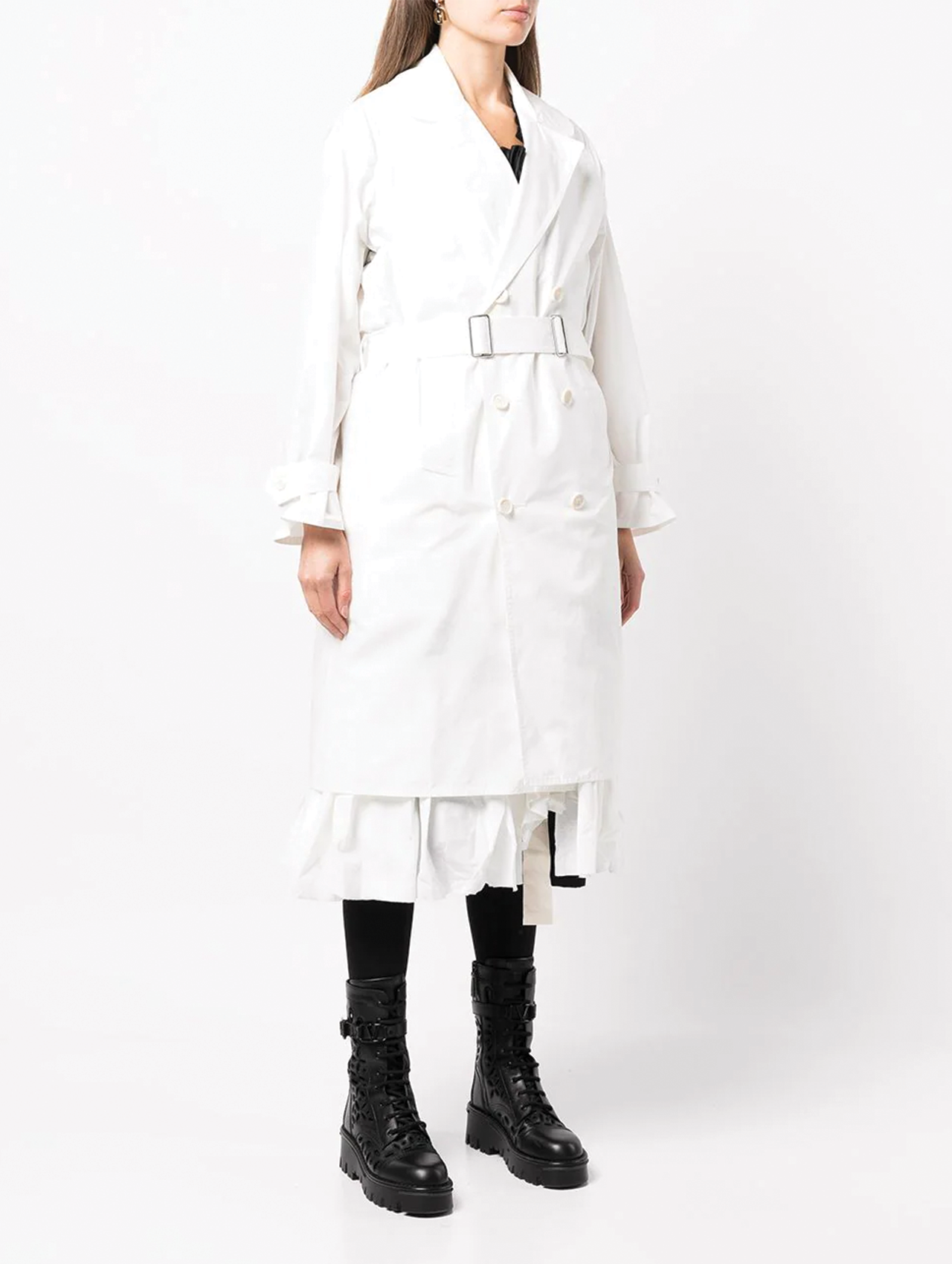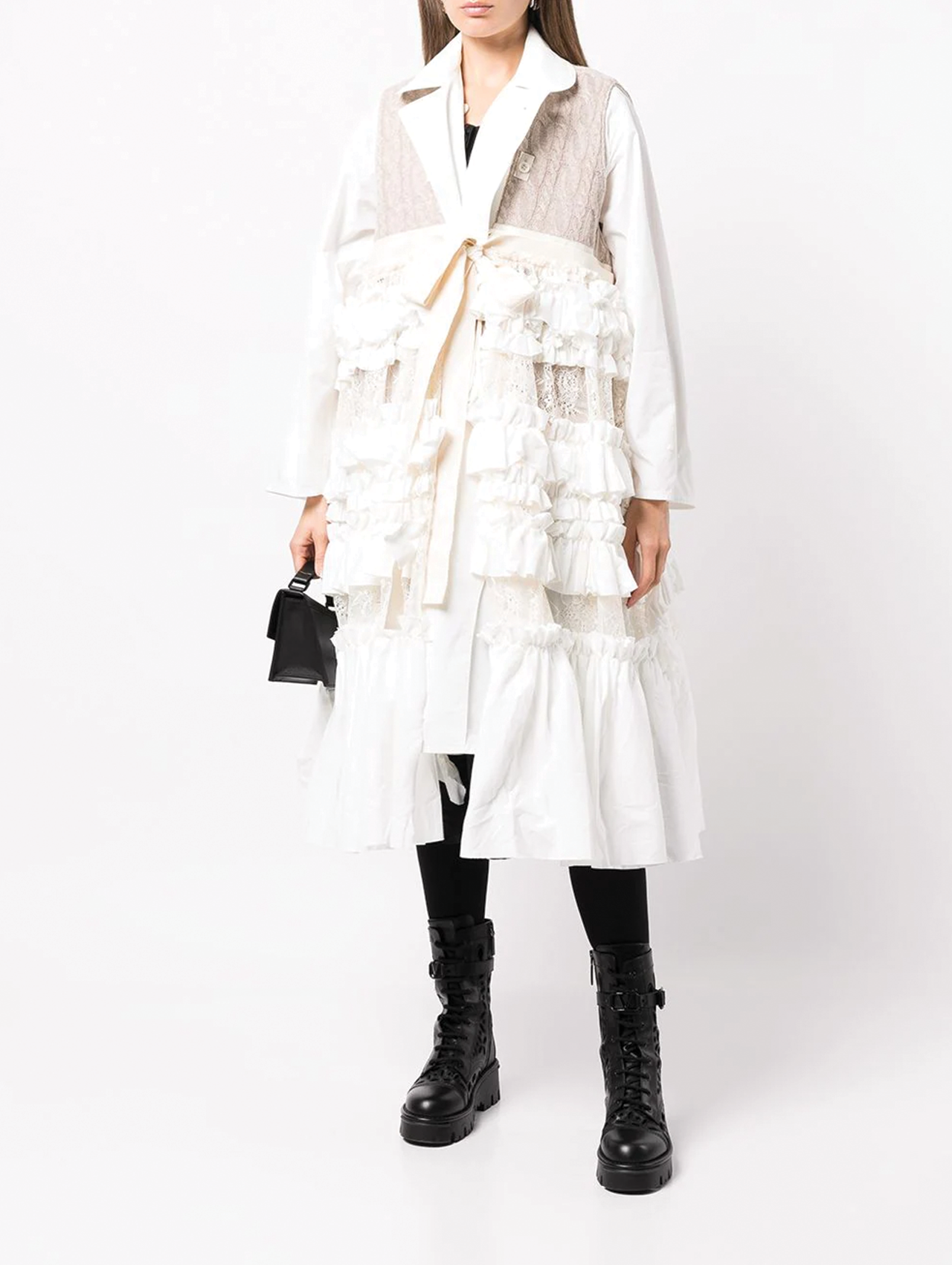This statement coat is an unexpected 3-in-1. It features 3 layers - a lightweight cotton trenchcoat, a beige knitted vest, and a tiered lace wrap skirt. The pieces can be hooked onto the coat and worn together as shown, or detached and worn separately. Led by Tao Kurihara, a Central Saint Martins graduate and former mentee of Junya Watanabe, Comme des Garcons TAO is an exercise in baroque, explicit femininity tempered by subtle masculinity. The evasive designer keeps her inspirations secret, but the mainstay visual elements of the line include up-cycled wedding dresses, folkloric whimsy, and frilled but distressed silhouettes that resemble punk imbued cake decorations.