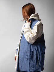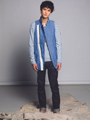 Designed in collaboration with Japanese designer Kohei Kawamura, our extra‑long lightweight chambray gilet is entirely handmade in Tokyo from a custom, denim‑blue cotton slub developed in a micro run by a mill in southern Japan. Its very long fit is accentuated by a contrast cotton band up the zipper and two low‑slung slit pockets. Inspired by the velveteen synthy sounds of Paris’ indie electronica scene, our debut clothing collection is all about beautifully-cut clothing of proper quality. Each silhouette in the collection was obsessed over for months before being put into production. This is get-up designed for early espressos, post-match pints, gigs, and good times.