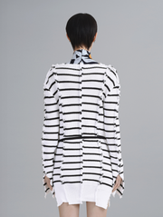 White and dark blue stripes, Raw edge seams, Removable tie belt