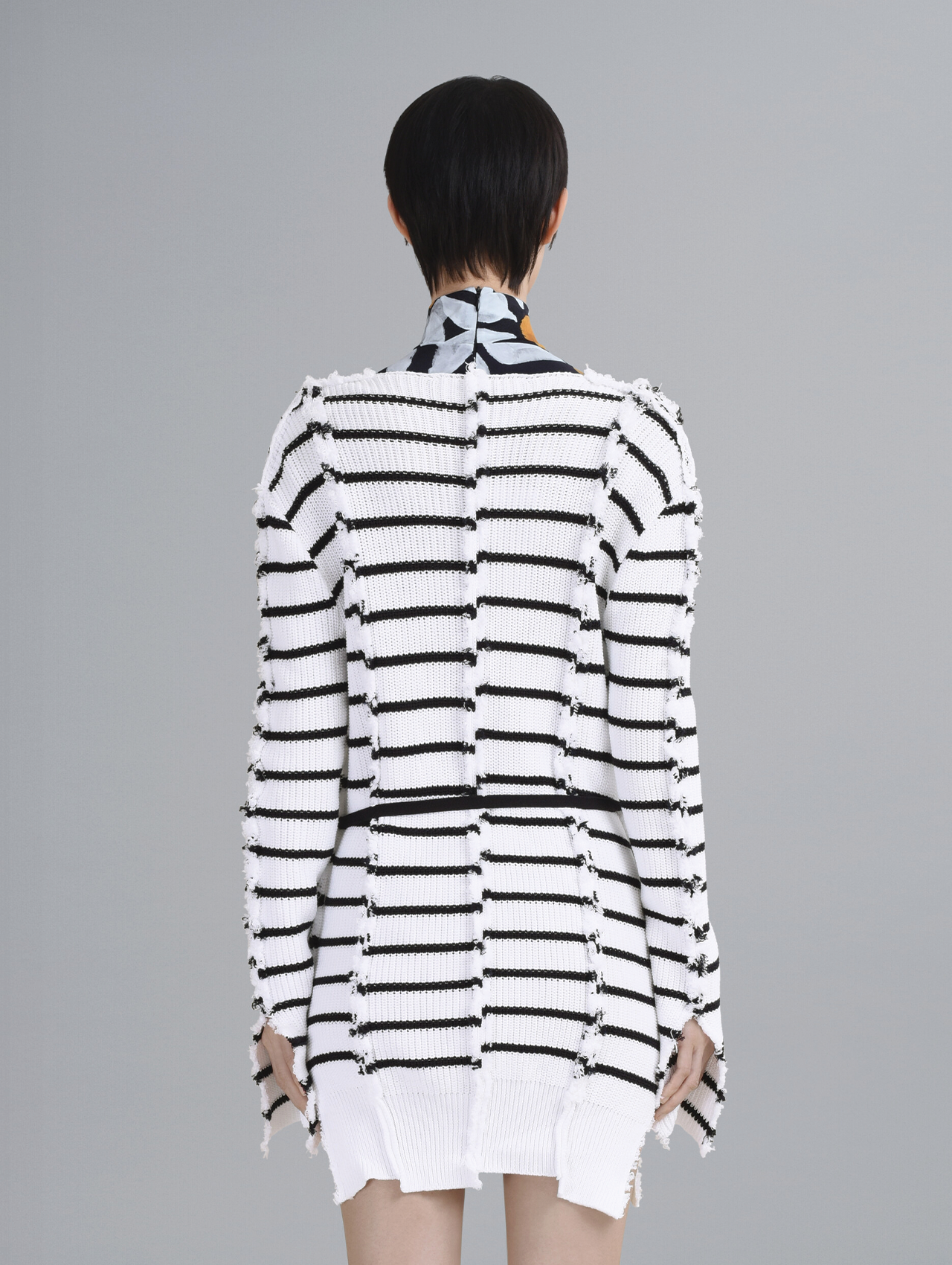 This chic cardigan is created with pieces of raw edged cotton rib, stitched together in a misleadingly casual manner. For Resort '22, Francesco Risso sought to make clothing that brings people joy. As always, the collection was a collaboration between friends and muses, serving as a way to cultivate community and celebrate the legacy Risso has brought to Marni so far.