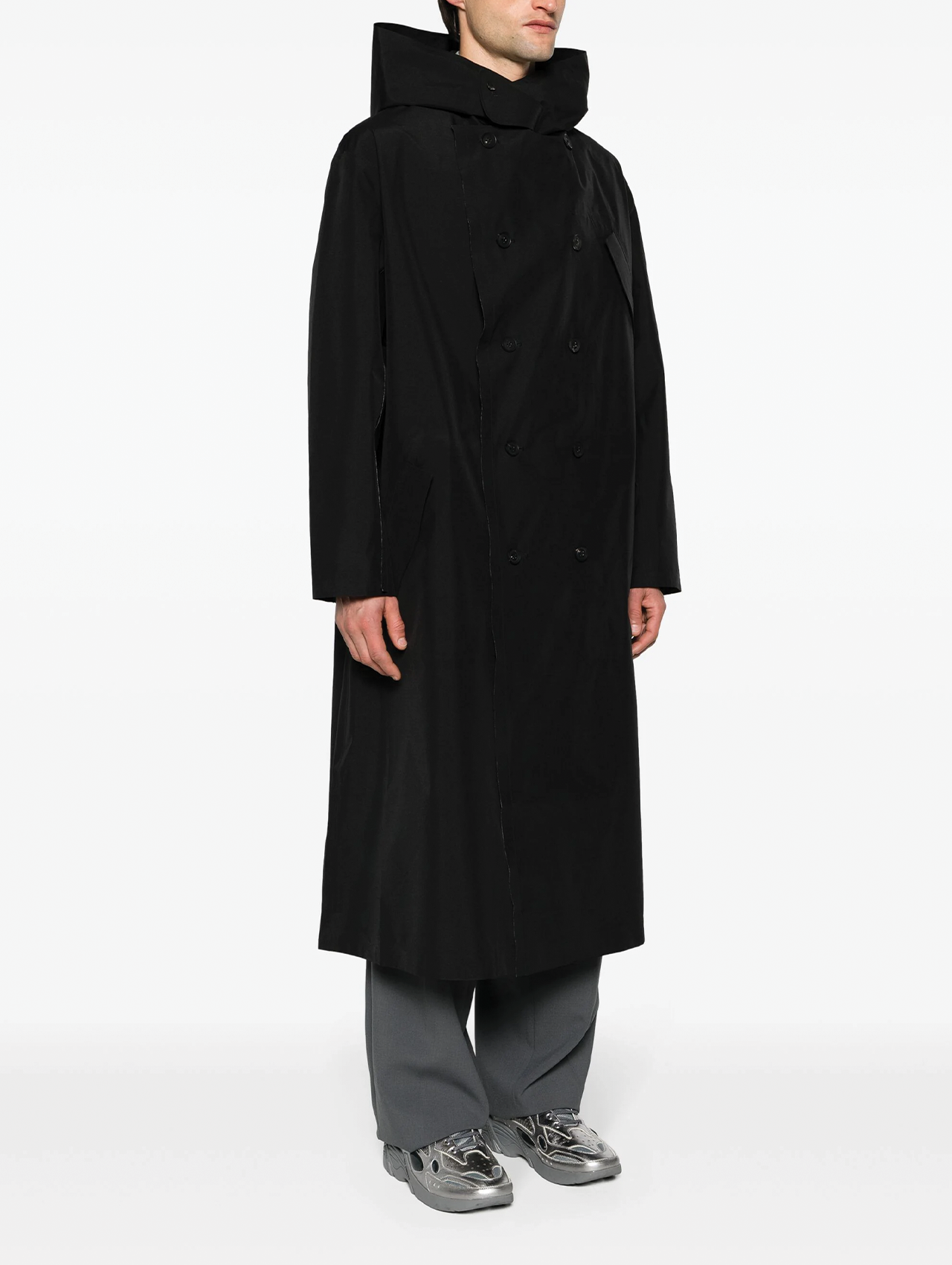 This reinvented trench coat is constructed out of waterproof GORE-TEX®. The oversized hood adds drama in true Yohji style.
