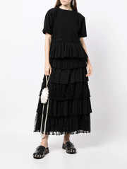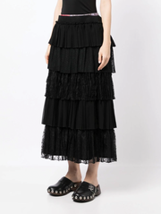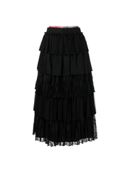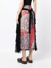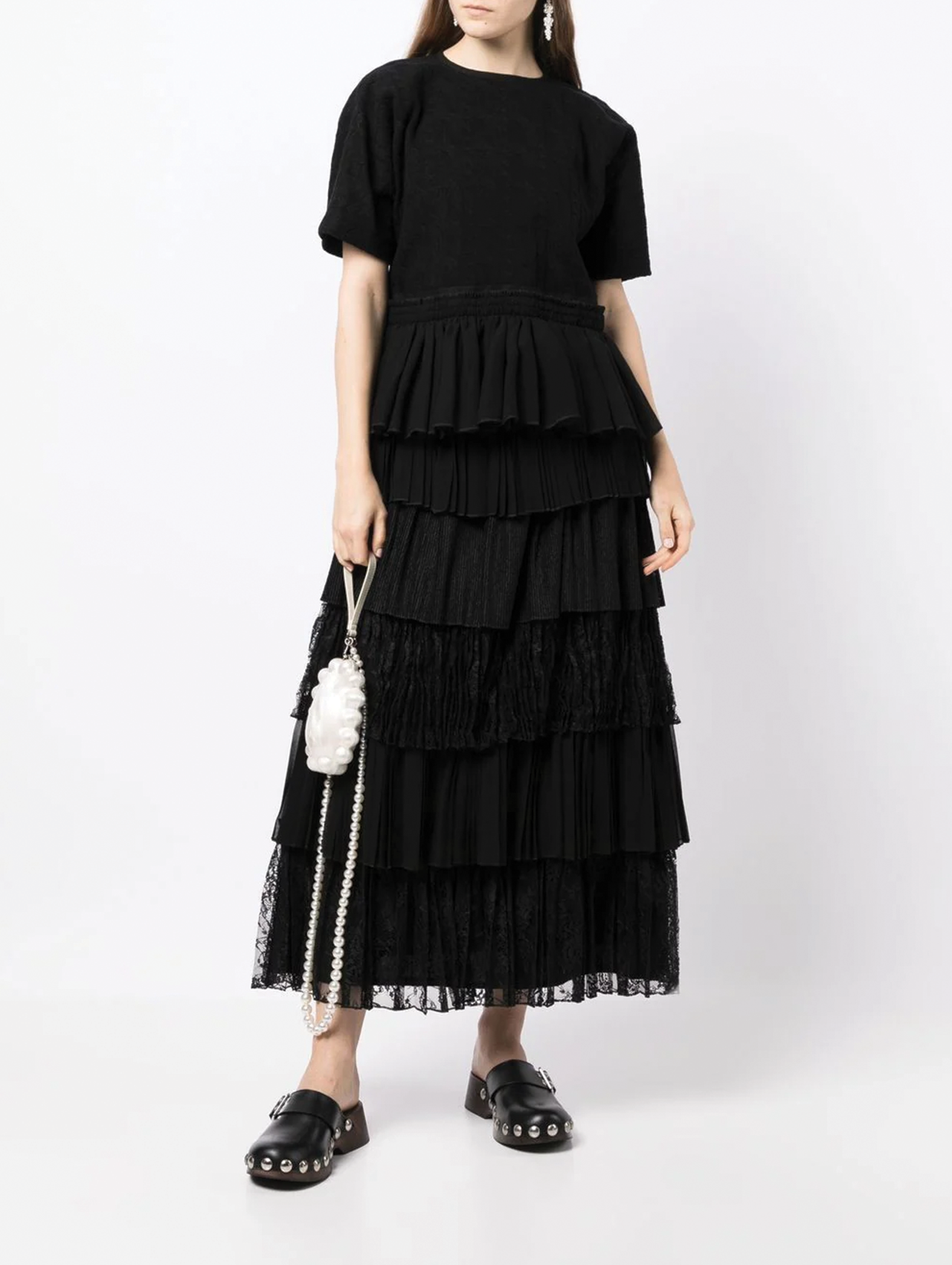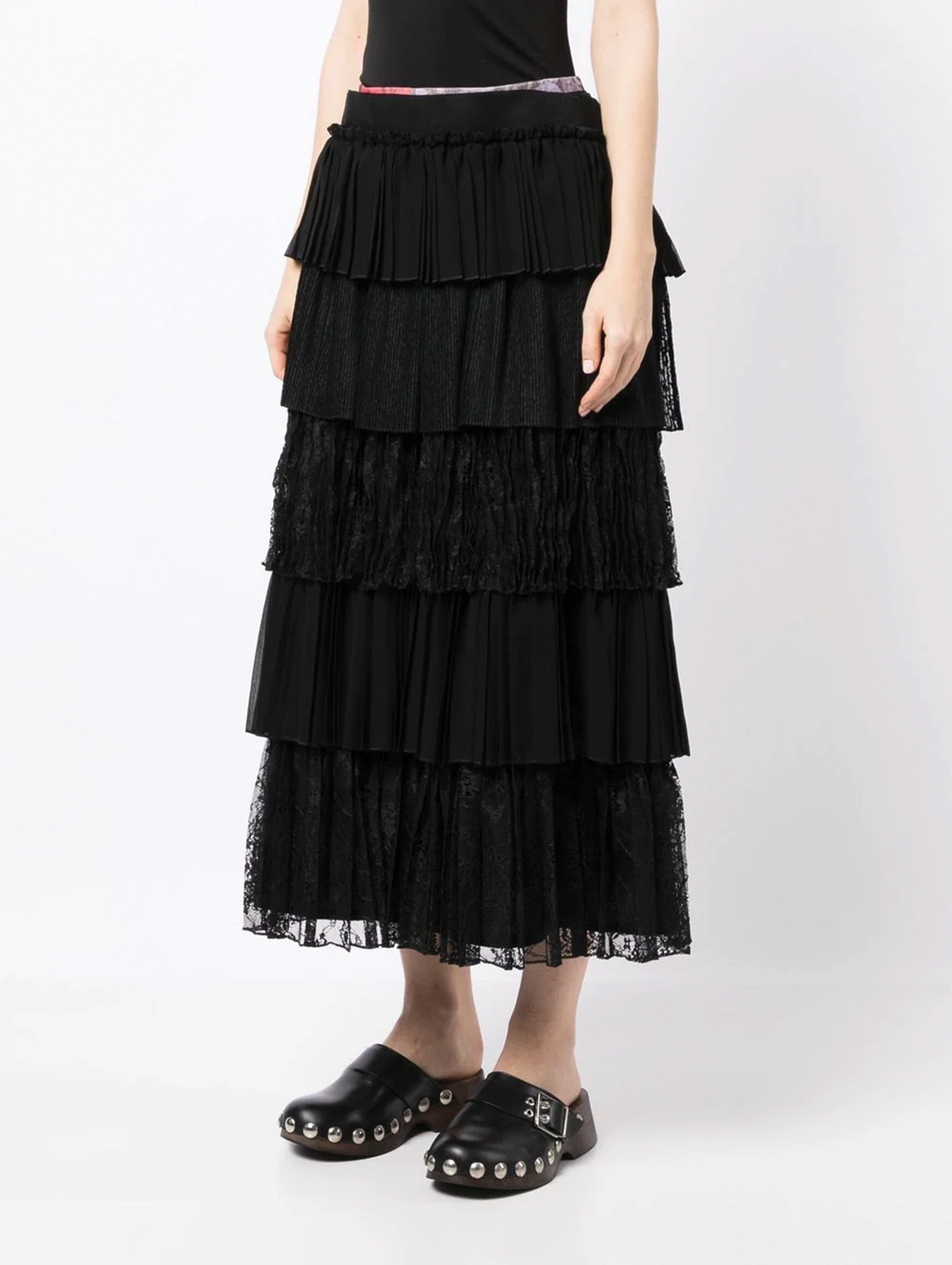 This floral velvet skirt comes with a detachable lace layer that can be worn in multiple ways. Led by Tao Kurihara, a Central Saint Martins graduate and former mentee of Junya Watanabe, Comme des Garcons TAO is an exercise in baroque, explicit femininity tempered by subtle masculinity. The evasive designer keeps her inspirations secret, but the mainstay visual elements of the line include up-cycled wedding dresses, folkloric whimsy, and frilled but distressed silhouettes that resemble punk imbued cake decorations. In typical TAO fashion, this embellished take on a staple garment can be dressed up or pared down.