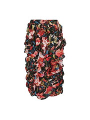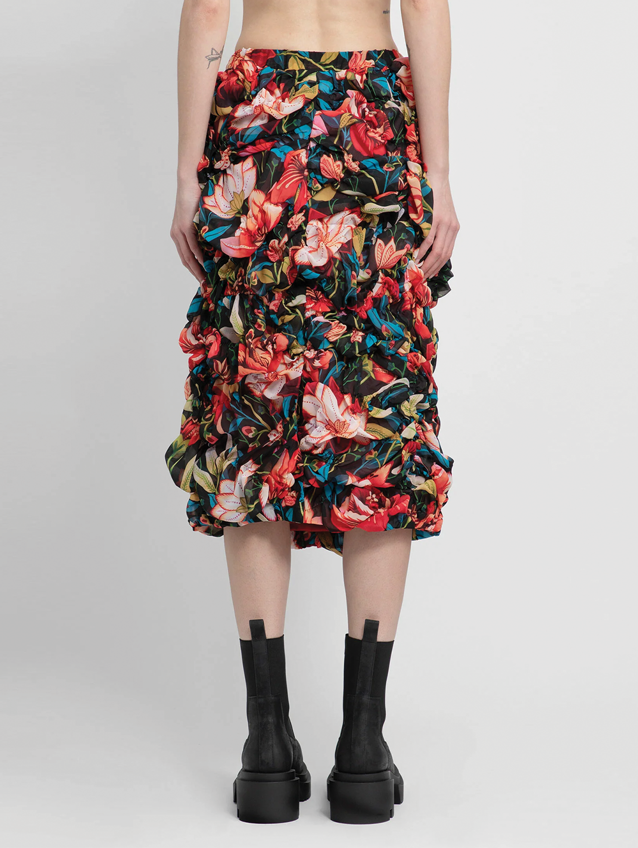 “I hope to present a light and bright future”, says Rei Kawakubo, in stark contrast to the sorrow themed collections of the past year. She strays from her archetypal blacks in favour of fierce colour, delivering grandiose shapes at mass volumes and textural trompe l’oeils. This ruched floral skirt is at once both elegant and subversive.