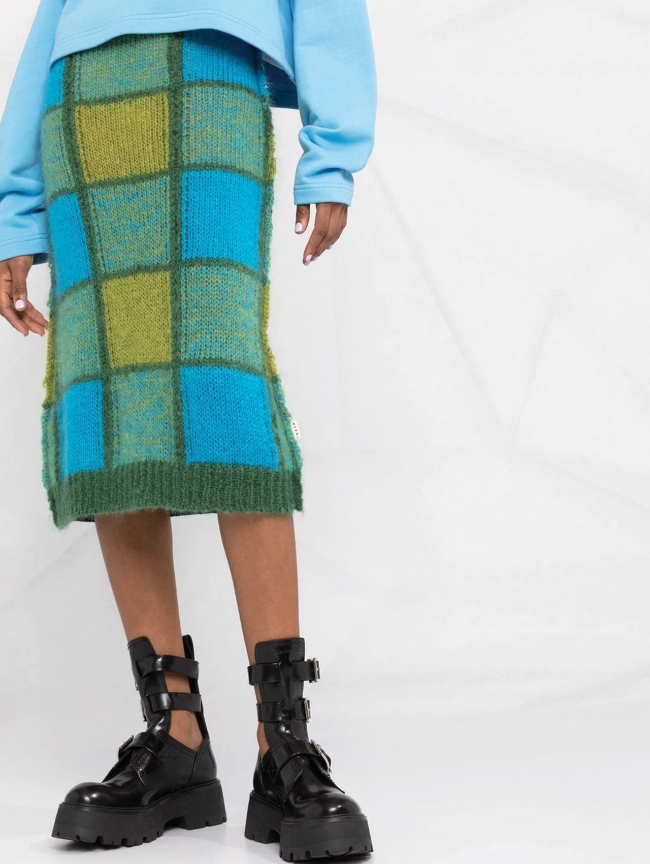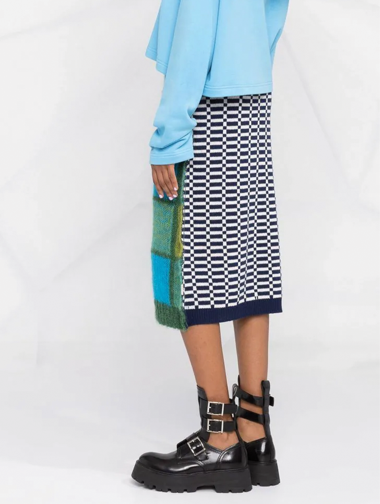 For this collection, the friends and muses of Marni were each asked to reflect on what they considered to be a ‘classic’ garment. The myriad of different responses showed that fashion is deeply personal and sentimental, an idea that Risso sought to evoke in the delicately handcrafted nature of each piece. The pieces that were sent down the runway were distressed, crumpled, and handstitched together as if they were lovingly mended hundreds of times. This fluffy mohair number is crafted from 2 contrasting knit offcuts and can be worn back to front if you're feeling bold.