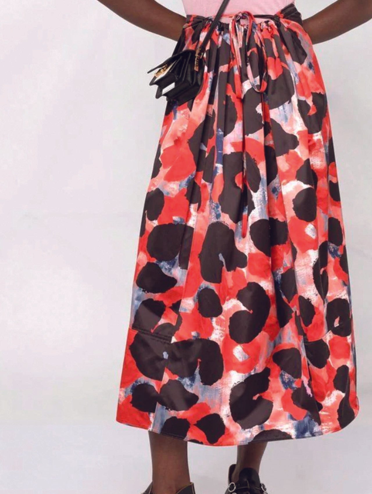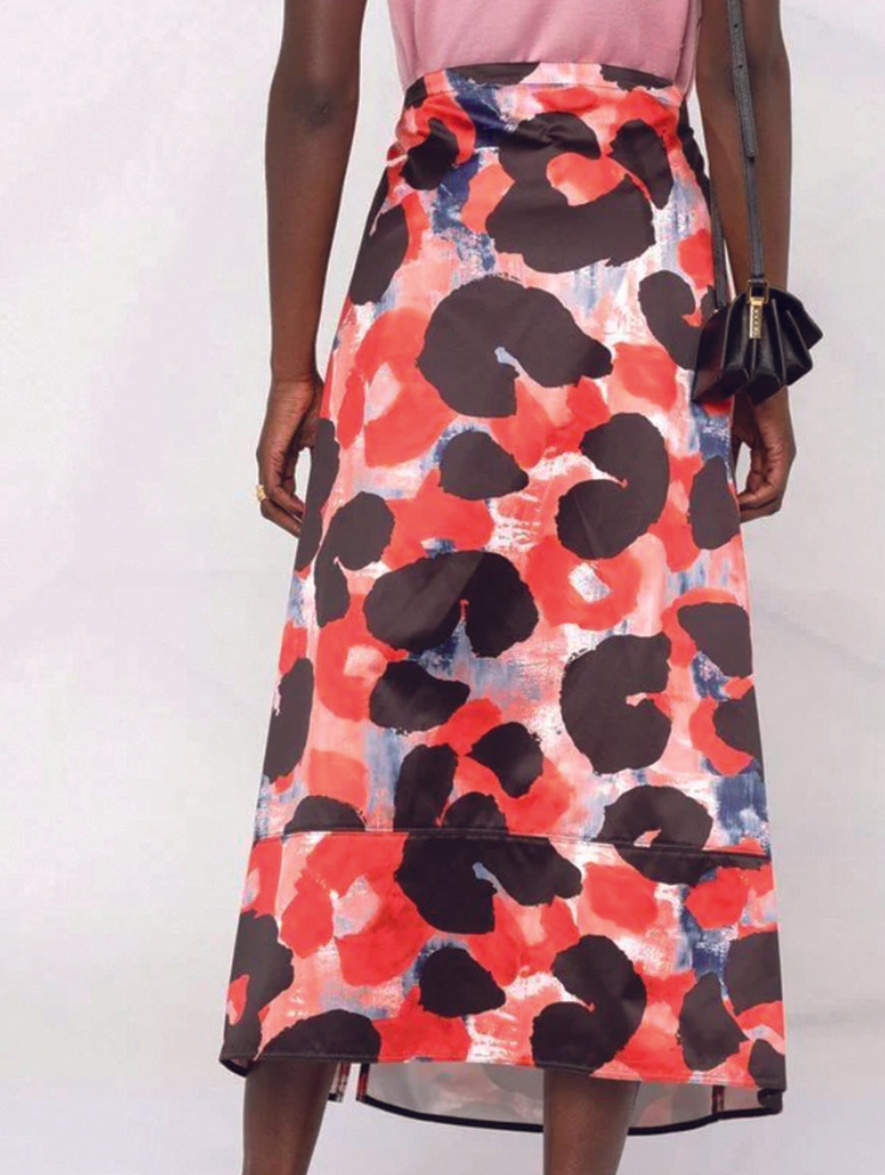 This silky soft skirt features an abstract print that's a little bit leopard and a little bit floral. Based on the idea that the brand’s creative process is always in progress, Volume 1 of 2021’s Spring/Summer collection looks at a deliberate clashing of aesthetics to illustrate the hybrid between Marni’s past and present. Risso describes the collection as “Joyful Liberation”.